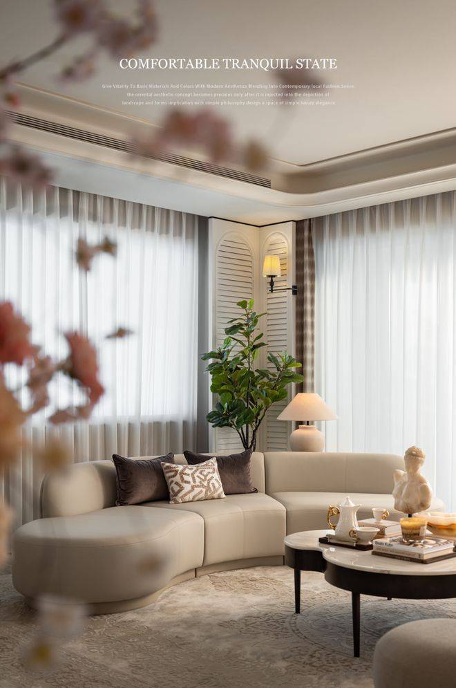 大面積落地窗引入自然光,柔和的白色沙發環繞擺放,溫潤的親和感與自然氣息在空間中糅合。