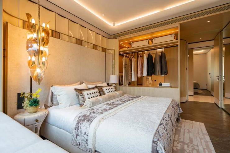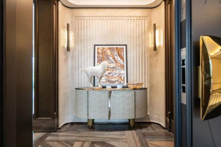 例如入户玄关铺设有“石材皇后”鱼肚印象”,这种级别的奢石在很多顶豪项目中通常仅作局部镶嵌