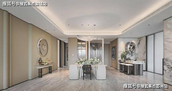 东区建面约320户型,将艺术感进一步融入日常中。特别设计的专属门厅空间,是从电梯厅延伸到家,如同一处艺廊,放慢人的情绪;室内选用了浅金色奢石(外界也称其为“芬迪白大理石”)作为主要的石材,曲面的木饰面也为浅色,整体给人以明亮感。