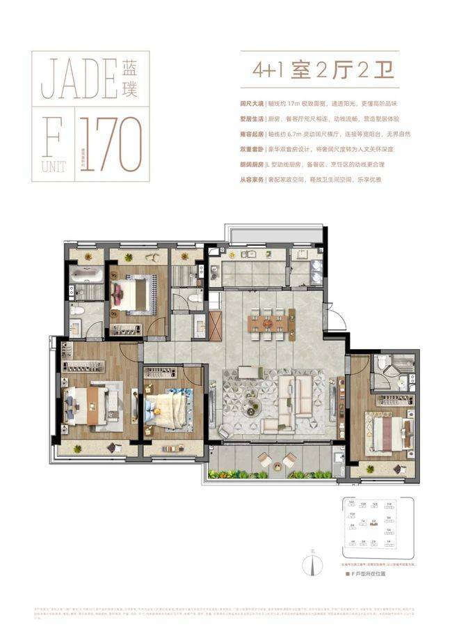 约 113-170㎡大面宽产品,面宽VS进深近似1:0.618的黄金比例,多开间朝南设计,最大11面采光,纵横人生绝佳尺度。