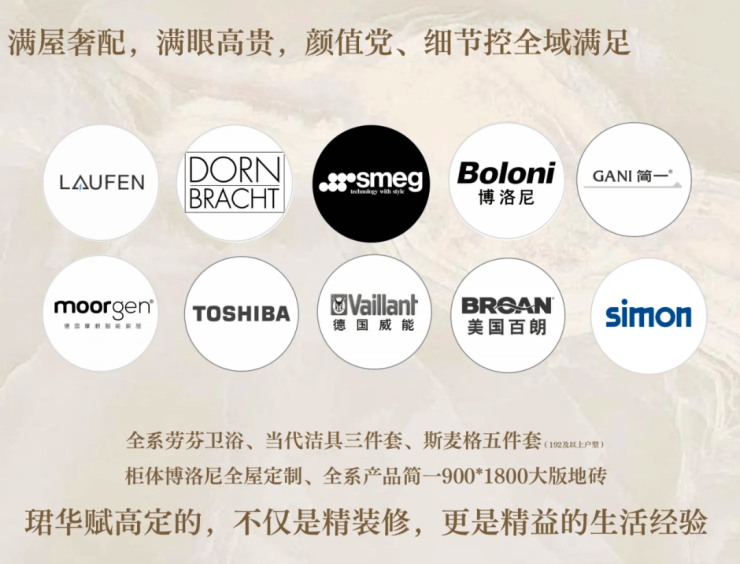 项目室内精装配置彰显顶奢品质,精选斯麦格全系厨电、劳芬全套卫浴、当代主卧洁具、简一地砖等国际一线品牌,并融入三面岩板背景墙等高端元素,共同构筑健康、精致且极具品位的居住空间。