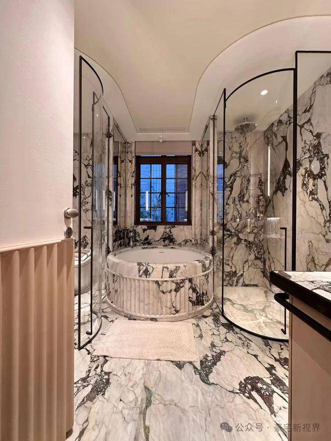 选材上,整面大花白奢石通铺背景,以天然石纹奠定空间高级感,底部配金属收口。灯光用多层间接光源,即吊顶弧形灯带与墙面隐形洗墙光,以柔和光影凸显石材肌理,营造温润静谧氛围。