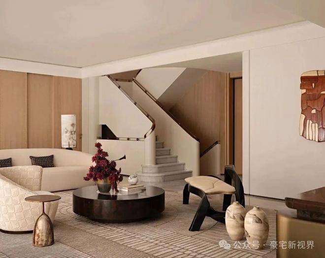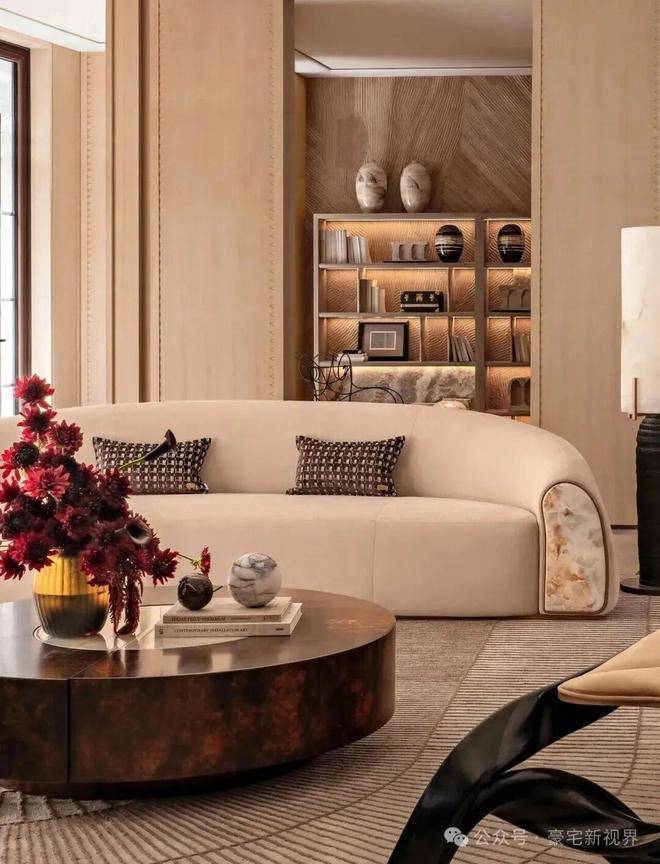 全屋摒弃方正硬朗的空间棱角,顶面用环形悬浮圆弧吊顶与内嵌灯带,弧形曲面包覆从顶面延伸至墙面,弱化建筑原生边界,拉伸空间纵深感,使客厅有温柔舒展的气场。
