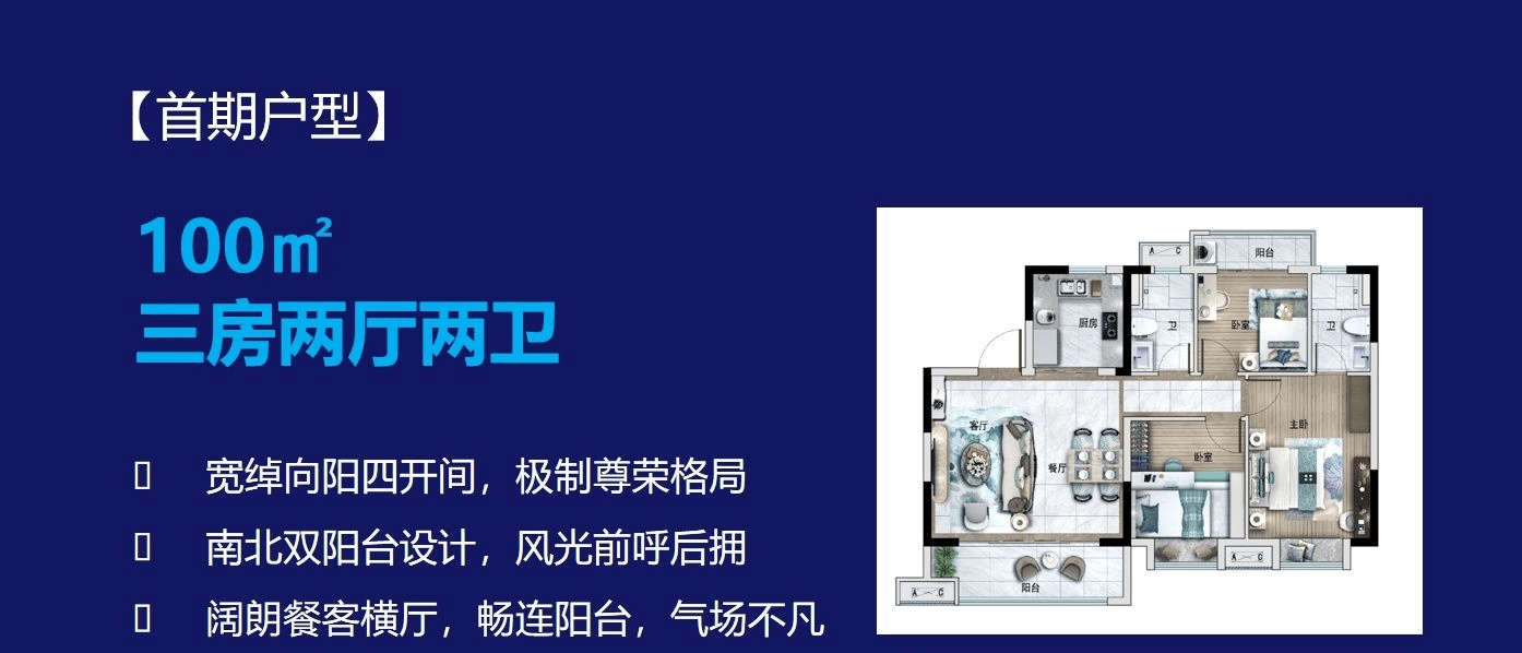建筑面积约98㎡明星户型,融入宽绰横厅、人性化双卫、南北阔景双阳台等设计,妥帖安放生活情怀。