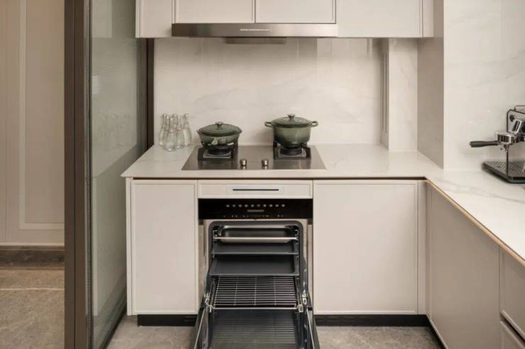 厨房:博世 / 嘉格纳高端全套厨电(烟机、灶具、洗碗机、蒸烤一体机、嵌入式冰箱),定制奢石实木橱柜,岩板台面,中西厨岛台一体化设计