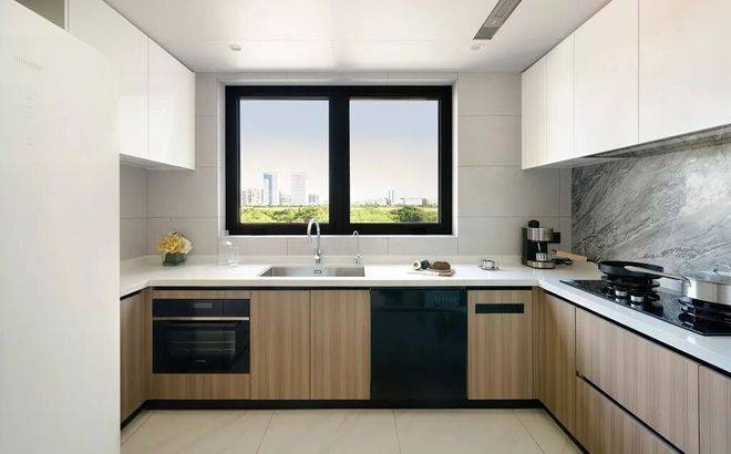 厨房里,方太升降式油烟机挥手即启,方太嵌入式洗碗机和贝克巴斯垃圾处理器让清洁变得轻松。