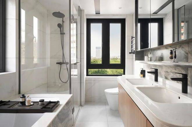 主次卫采用同标准的全套高仪五金、智能马桶盖与奥华线型浴霸,而部分主卫更是双台盆配置,且镜柜内暗藏了美妆冰箱与消毒牙刷架,把健康与精致融入每一个清晨与夜晚。