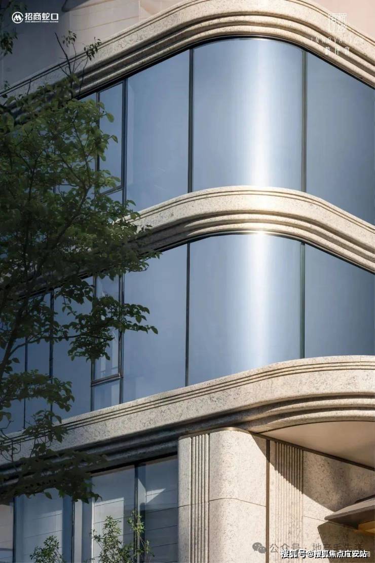 南北两侧立面均是超高的窗墙比,并配以大面落地玻璃.层间线条则是铝材和石材的点缀结合,使用了大量的曲面弧形石材.用的还是跟合肥招商玺同款的「双曲倒弧工艺」,成本非常高.