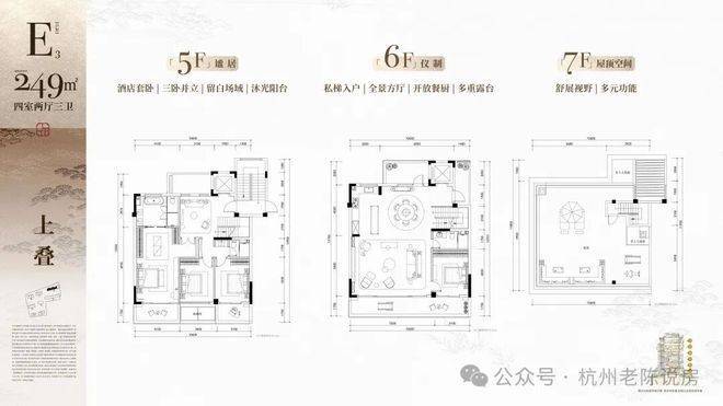 上叠采用创新上入式设计,打破传统空间格局,将客厅置于顶层,推窗即揽城市天际线与塘河风光,并配备超大屋顶赠送空间,可作为星空露台、空中花园或休闲茶室,白日邀友远望西湖叠翠,夜幕围坐仰望漫天星河,生活惬意生长。