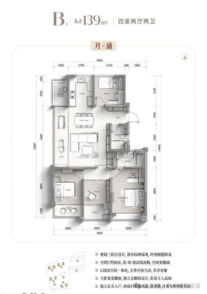 125㎡ 4室2厅2卫(中间套)四开间朝南设计,南向面宽拉满,采光通风效果俱佳;LDKB空间一体化布局,灵活适配二孩家庭日常居住需求;主卧套房设计,配备独立卫浴与专属衣橱,私密性十足;封闭式阳台可灵活改造,进一步提升空间利用率!