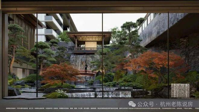 归家礼序:奢阔门头+一轴八境园林:打造约63米宽、9.1米高的超全画幅恢宏门庭,融合金属格栅与天然奢石,以酒店级匠造标准诠释当代世家气派;园林布局取意三大宋画,融合杭州山水精粹,打造“一轴八境”景观,通过假山、叠水、屏风等元素,再现《四景山水图》的移步易景之美,窗前皆有景可赏。
