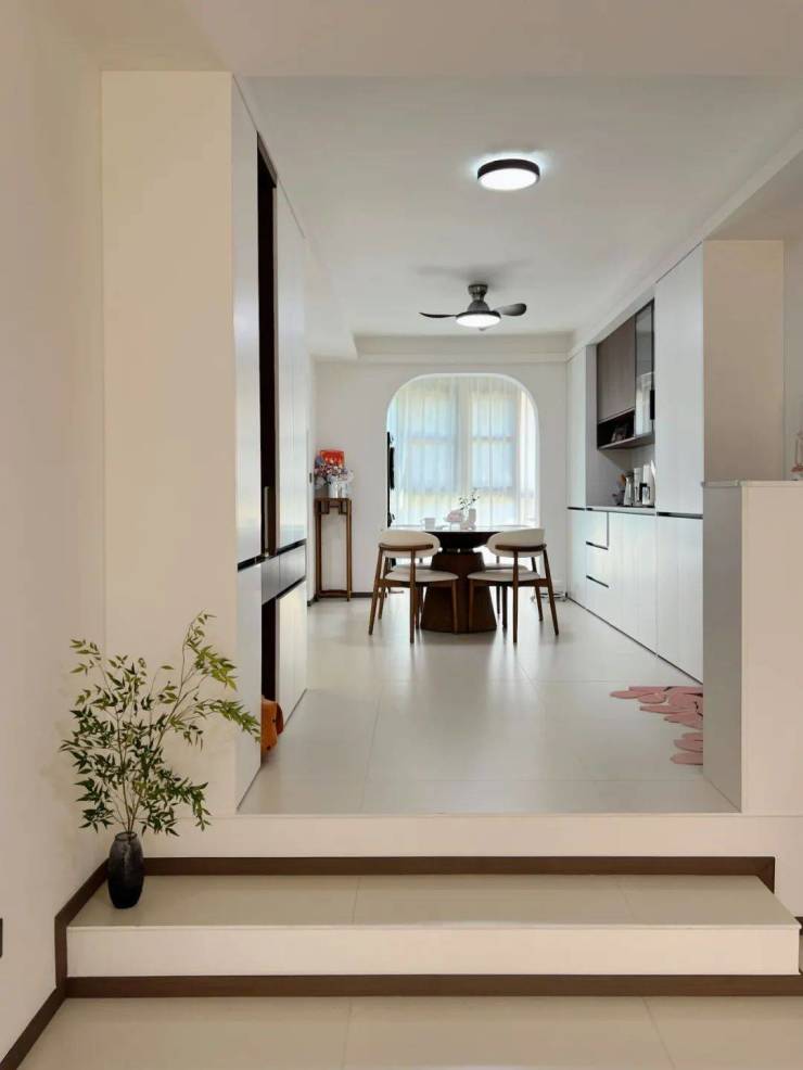 2. The living room and dining room are connected by steps: The most primitive "height difference" method is used to achieve zoning in a vertical dimension that occupies zero space, maintaining over 90% of visual transparency.