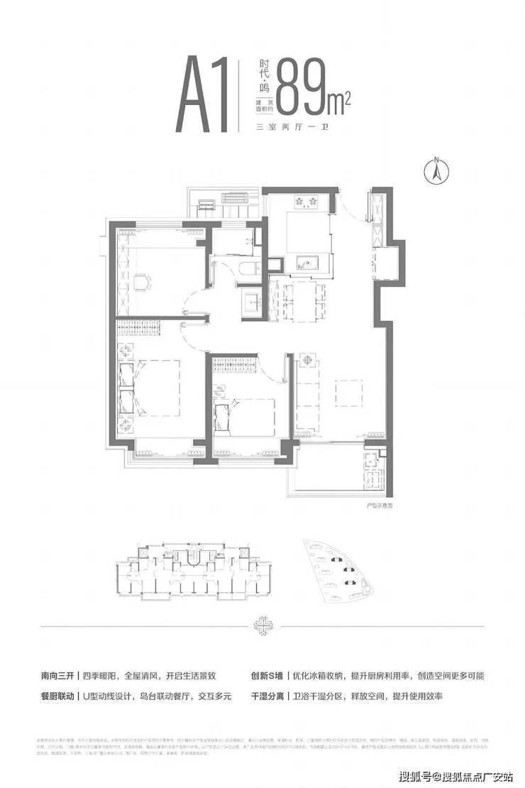 建面约89平的三房两厅一卫, 400万级别主打低总价,三开间朝南,通过S墙的设计解决了冰箱空间问题。
