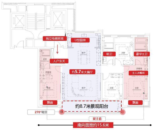 比如大横厅,改造性超强,U型小西厨+餐客厅+连通阳台,270°环幕视野,开间长约7.8米双联阔景阳台,尺度无敌!