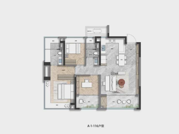 建面约116㎡3房2卫动静分离的户型,几乎是这个市场上最好的户型。