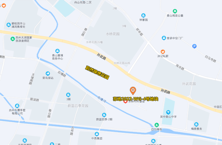 交通上面,主干道孙武路就在小区北侧,往东可以通过子胥快速路直接连接中环西线。轨交上面,小区距离5号线太湖香山站约2.5公里左右,5号线预计今年年中就会开通。