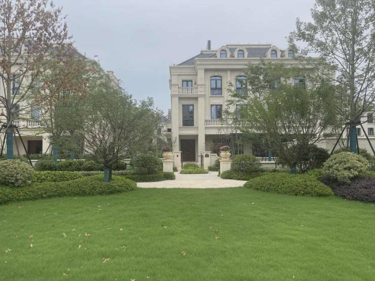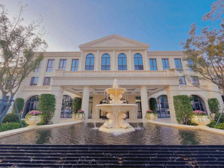 整个园区,以经典的绿城法式墅区景观大中轴贯穿,占地约1000多㎡,联排建筑的设计,融合了中国传统院落布局与法国枫丹白露宫的审美,外立面大面积采用全石材干挂,檐口等细节部位使用仿石。