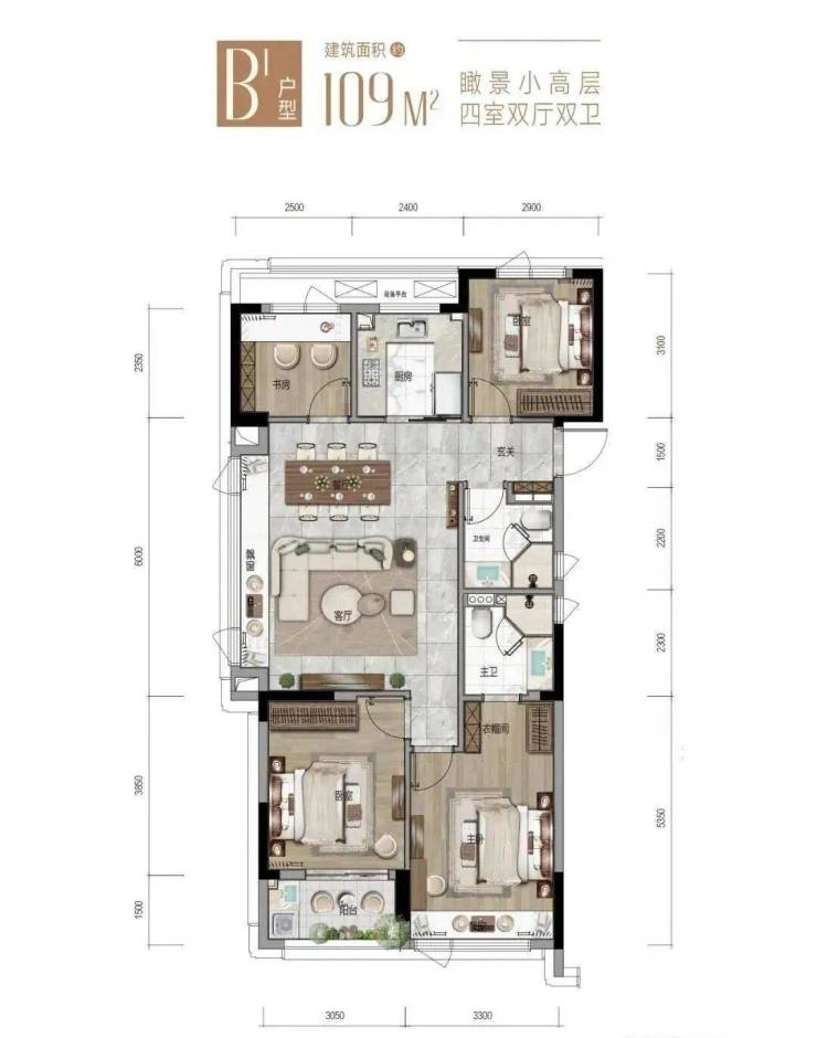 以小高层建面约109㎡的边套为例,居然做到了四房。这是充分考虑到了孩子上学后的住房需求,因为老人很可能要住过来照顾孩子,一家三代人,四房肯定要的。