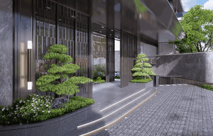 现代中式风格建筑立面,呈现出高超级的力学和美感,采用石材+铝板+真石漆搭配,其中1-2层全部选用干挂石材+铝板线条。不但大气美观,更能在时光的洗礼中历久弥新,这在昆山市场中,是极具竞争力的!