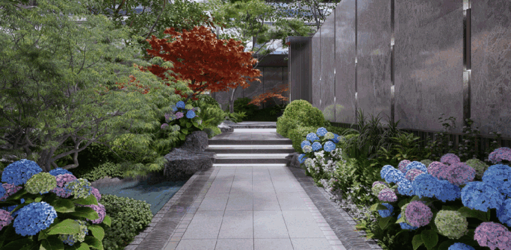 渐入园内,寻山望府、步云展虹、山静日长、枳花明墙、卧石临流、饮绿归园六景层层递进,打造功能不同的宅内空间,林荫树阵,繁花点缀,行走其间如同身处于画中。