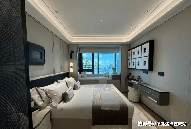 主卧背景墙更以威尼斯安缦酒店同款树瘤木,搭配巴黎宝格丽酒店同源羊皮纸,将全球顶奢酒店的居住质感搬进家中,每一处选材都彰显塔尖人居的高奢基因!