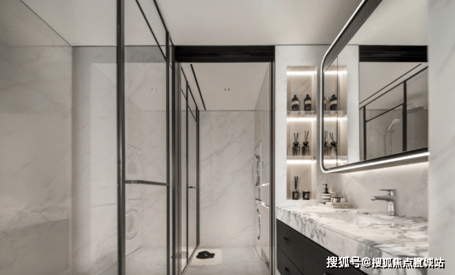✔高定选材 :玄关地面选用“白雪公主”玉石,质感温润高级;地面延展祥云灰水墨岩,与外滩华尔道夫酒店同源材质,瞬间提升空间格调!