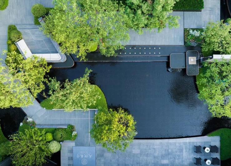 跨水景观是江南地区独有的风貌,河道宽度适宜,廊桥与河水交织,以斑驳的石铺营造的蜿蜒曲径隐匿其间,千回百转,两岸绿树成荫,如诗如画,漫步其中,一呼一吸间感受富氧自然。