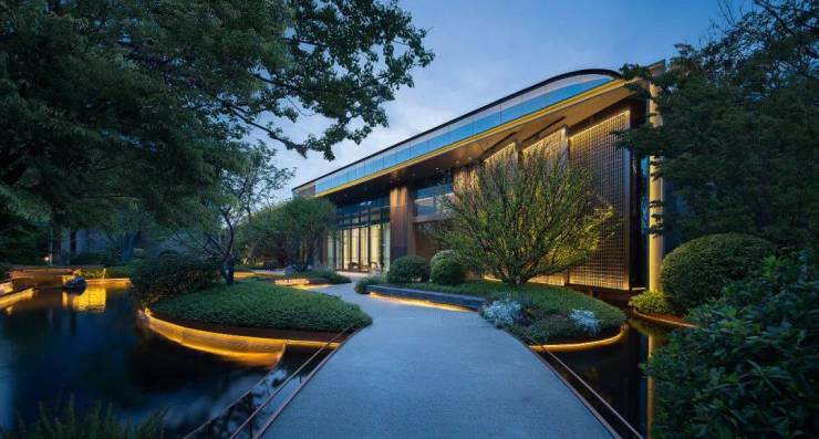 城市的喧嚣在这一隅园林中被沉淀,天色低垂,一池澄澈水面映衬着水乡的灯火通明,设计将夜幕中的灯火点缀在景池中,如江南繁华初绽,繁星摇曳。