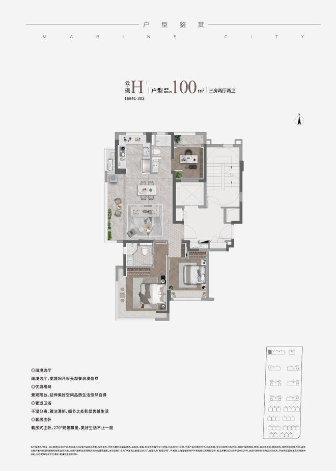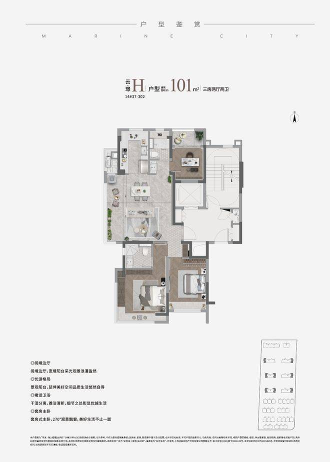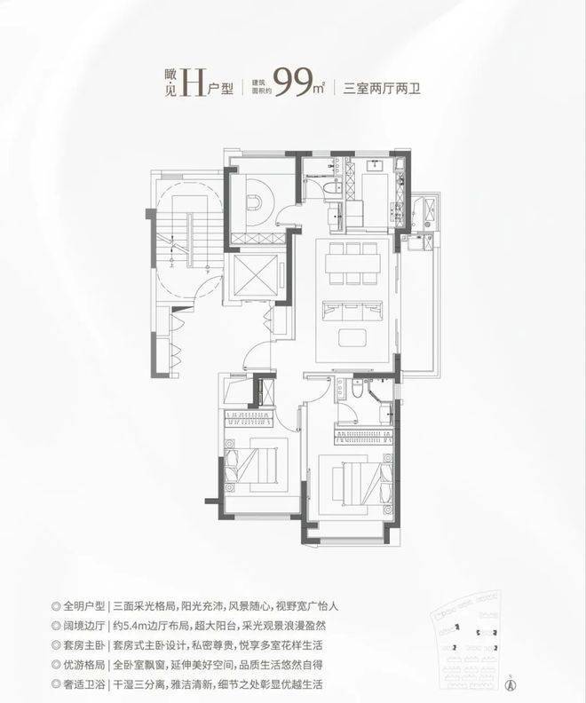 ②建面约99㎡H户型:三面采光,全能景观王炸边厅户型!