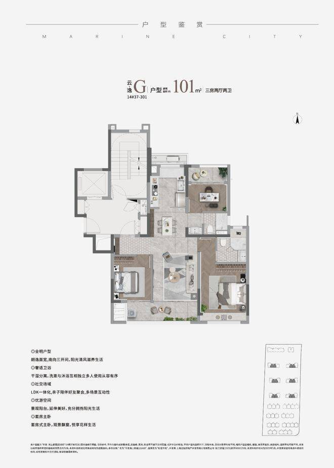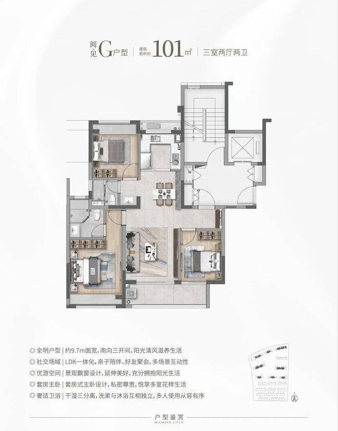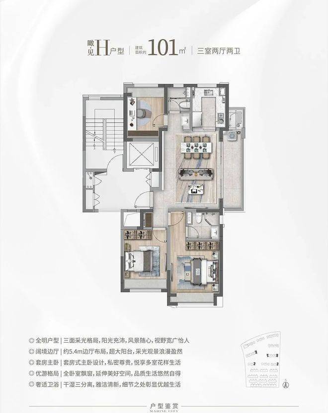 建面约101㎡户型,做到了3房一步到位,购房者也无需更多纠结,同时还可获得更统一的圈层;