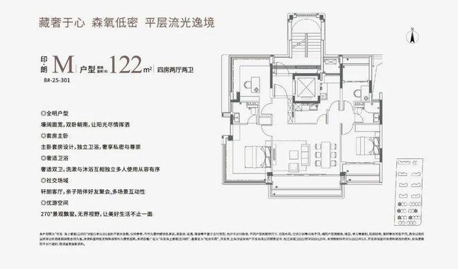 建面约122㎡的中叠四房,大平层式设计,宽尺横厅+阳台+270°主套飘窗采光条件极佳,每天早晨都被阳光晒醒。