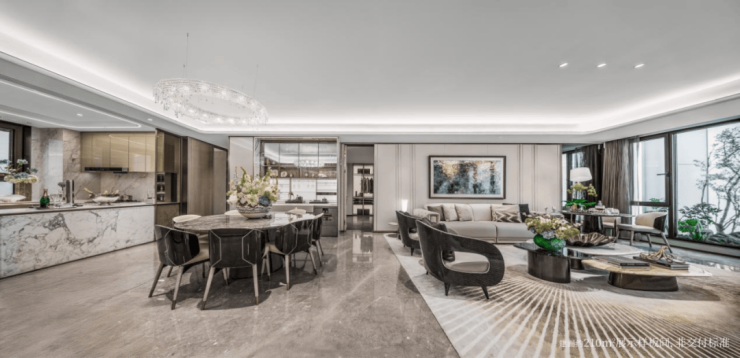 玄关、客餐联厅、厨房与阳台一体贯通,形成建面约100㎡社交巨厅,可容纳10人大圆桌,聚合社交、筵席、娱乐等多元场景,尽享欢宴与聚会。