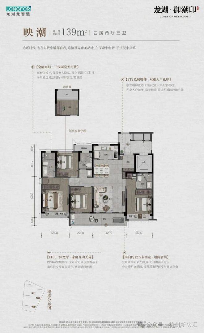 约139方户型,南向面宽则达到了惊人的约13.9m,四开间半朝南,客厅面宽约4.2m。关键做到了3卫双套房,特别适合三代同堂。同样约139方三卫,世纪城的君品是2T4的,而御潮印则是2T2,独立私梯入户,还拥有阳光入户花园和双重玄关。