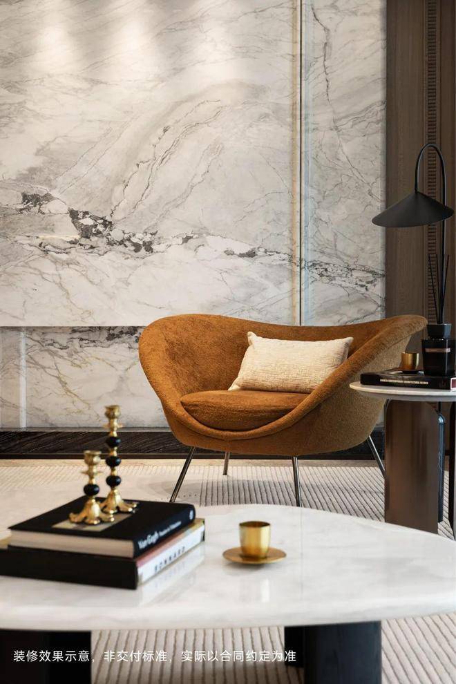 客厅背景墙的“烟雨江南”天然大理石,不同于传统平面背景墙,通过弧度及立体的造型处理,并镶嵌不锈钢材质,对于金茂而言,比奢石昂贵的,是让奢石真正与空间气场融为一体。