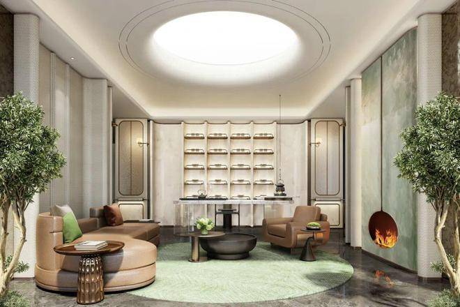 采用“王府中式”设计,大门为歇山顶形制(宽53米、高近11米),配黄铜狮、罗汉松及蓝翡翠奢石。园林融入西湖十景元素,如“花港观鱼”水景、“柳浪闻莺”绿植,并设雾森系统首层单元门厅石材铺就,肌理沉稳。