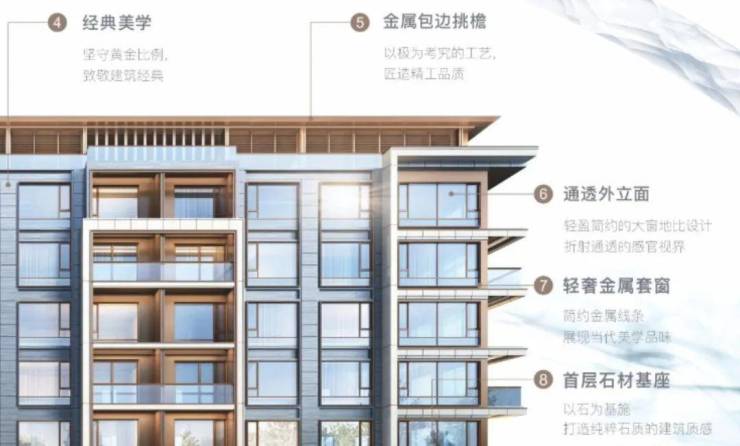 2、轻奢质感外立面+超大窗墙比设计,室内光线和视野都非常好。项目外立面采用大尺度开窗,用材包含首层石材基座、金属线条等,这种设计不仅可以保证户型光线,外立面看起来也非常大气。