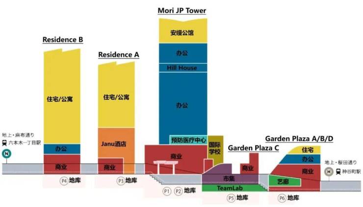 比如东京麻布台之丘,作为一座超级城市综合体,混合了商业、办公、酒店、教育、艺术,及顶尖豪宅,其中楼王顶端的安缦公馆,成为全日本最贵豪宅,售价达100万/㎡。