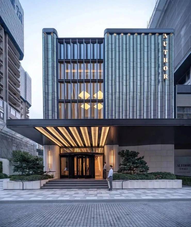 入口的会所立面,采用 独家调制的幻彩铝板,不同时间不同阳光照射下,会呈现不同色泽,一眼就流光溢彩比肩高奢酒店。