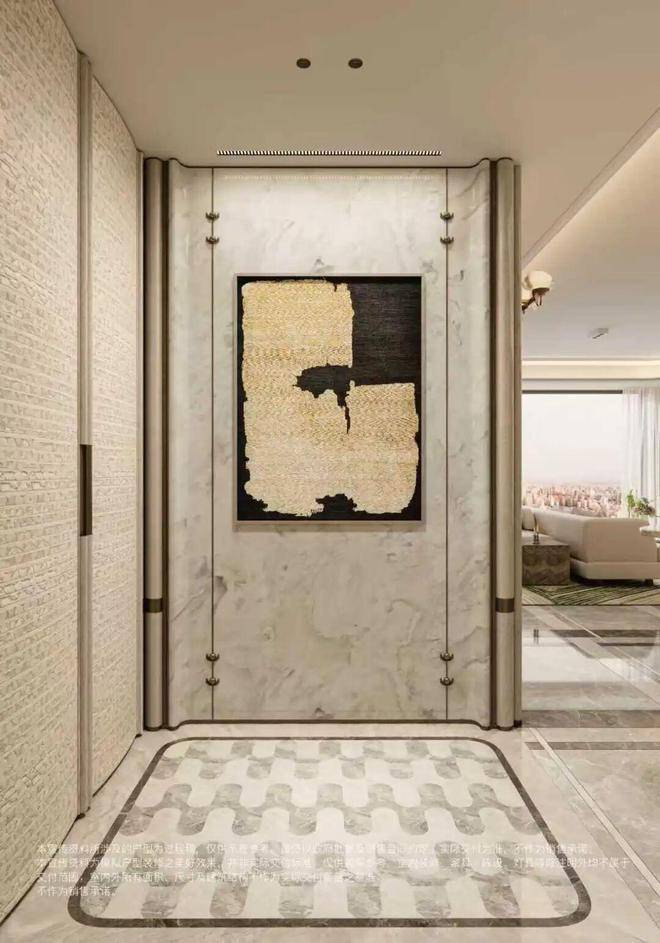 约2㎡玄关拼花采用胜利拱券 ×全水刀工艺!超高压切割让石材切口平整无崩边,结构更稳定,搭配天然石材的高硬度属性,长久使用依旧光洁如新,省去后期维护烦恼。