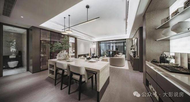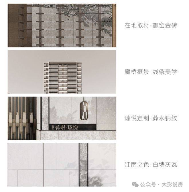 保利姑苏瑧悦取法苏州园林的廊桥框景线条美学,演绎为框体线条造型和简洁舒展的立面肌理。在地取材,运用质朴拙雅的御窑金砖,提取粉墙黛瓦的江南之色,定制兼具东方韵味和现代质感的蟒水纹,呈现与众不同的东方韵律和建筑表情,让家成为城市中一眼的确定。