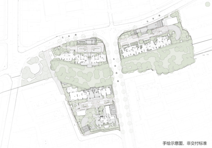 绿城在三个地块之间,做了精巧的构思。项目保留了原生在地的香樟,在地块间打造香樟聚场,这些公共绿化将三个地块串联为一座有活力的城市单元。
