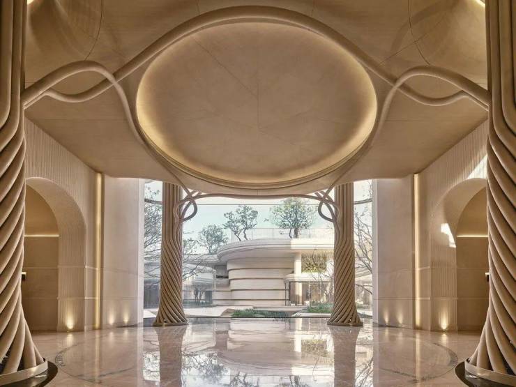 大堂「生机之亭」高约15米,凌空矗立为归家动线的核心枢纽。藤蔓枝干与天花交织缠绕,地面与顶面纹理呼应,共织以森林韵律为魂的生态栖居归家仪式。