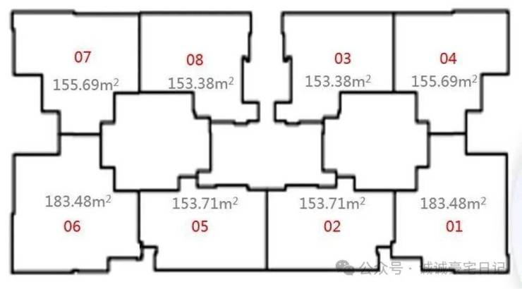 该栋分为A/B单元,每个单元有四个单位:包含3套153㎡及1套183㎡,平面布局与住宅相似。