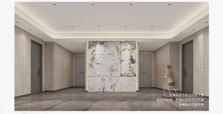 注重归家的仪式感,更重视心灵的归藏,奢装地上入户大堂,公区墙面地面均采用仿石材墙砖,大堂主背景采用仿石材岩板,搭配古铜色不锈钢踢脚线收口线,营造尊崇的入户体验,彰显奢宅生活主张。