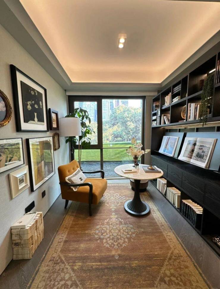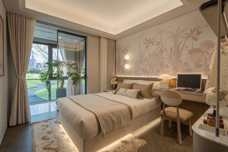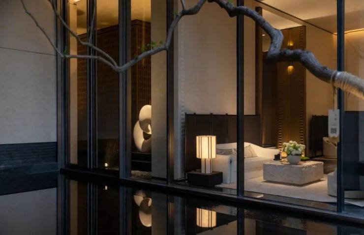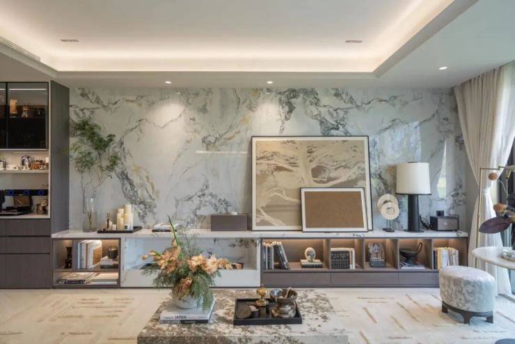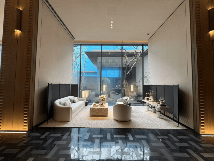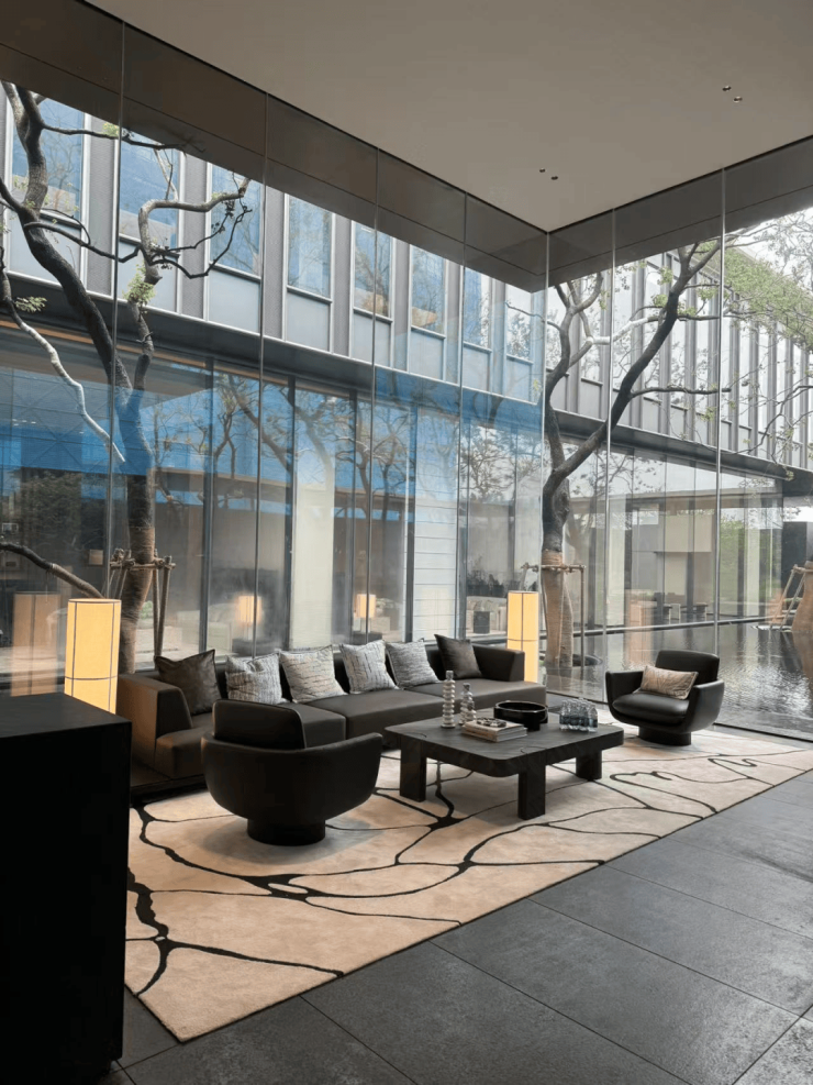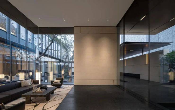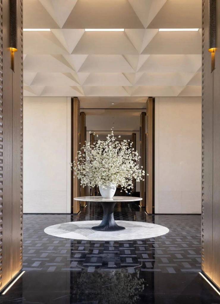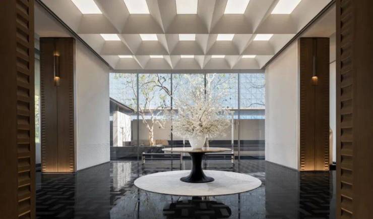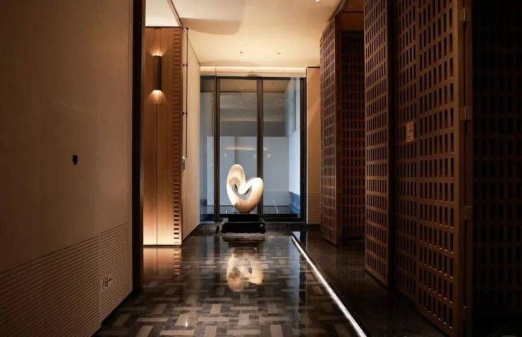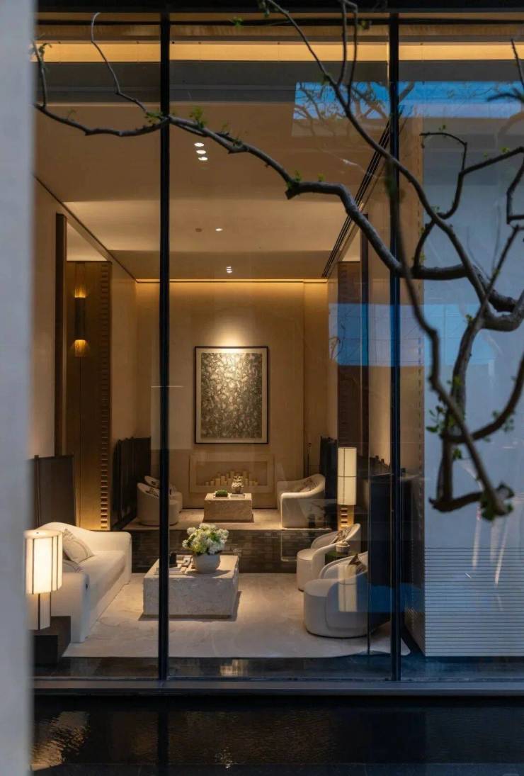 整个示范区,名贵木材与石材铺就雅致地面,墙面精选保加利亚维纳多石材——与北京宝格丽酒店同等级别——以及翠谷幽兰的奢华石材。其中,五株珍稀铁冬青代表着五福临门的美好寓意,而七颗乌桕树则象征着七星追月的独特意境。