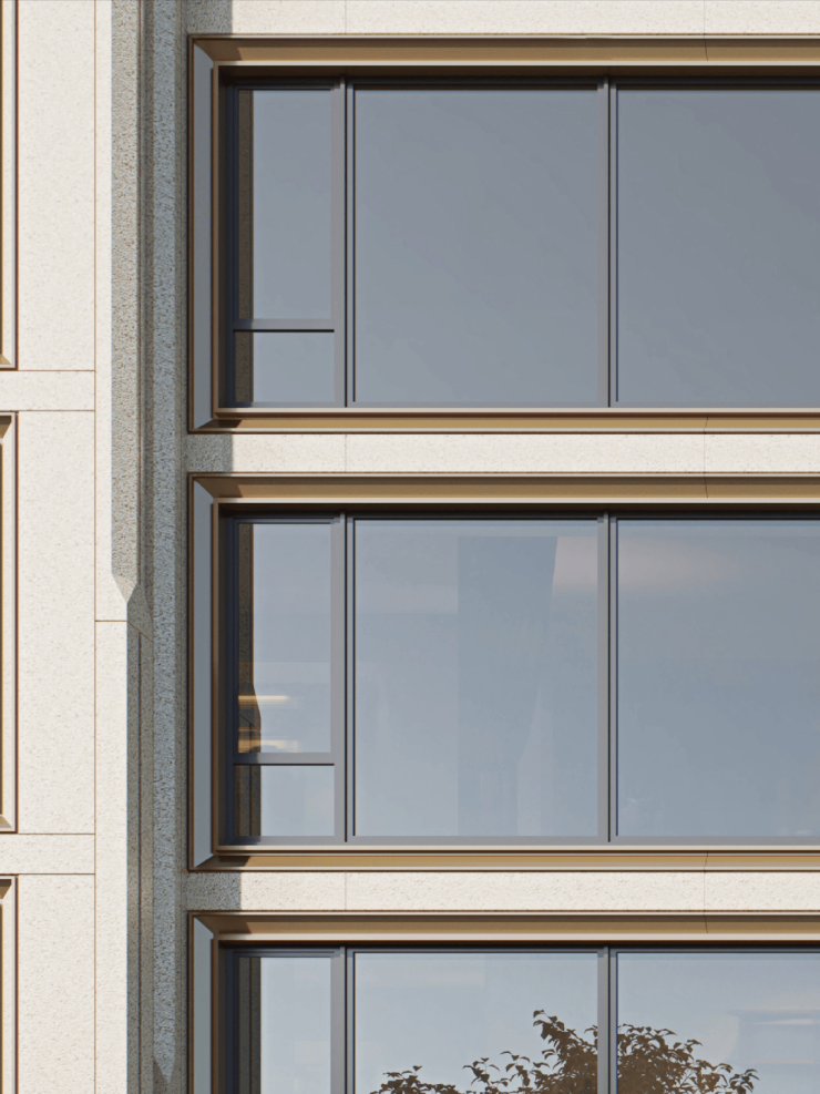 建筑立面以翡云润府的材料精髓为灵感,打造独具特色的建筑立面,运用简洁而富有国际感的线条框架,重塑云城中心的天际线。整体采用大面积玻璃与暖金色金属铝板,局部点缀暖色石材及香槟金金属型材,辅以独特的塔冠设计,成就超高颜值的标杆之作。