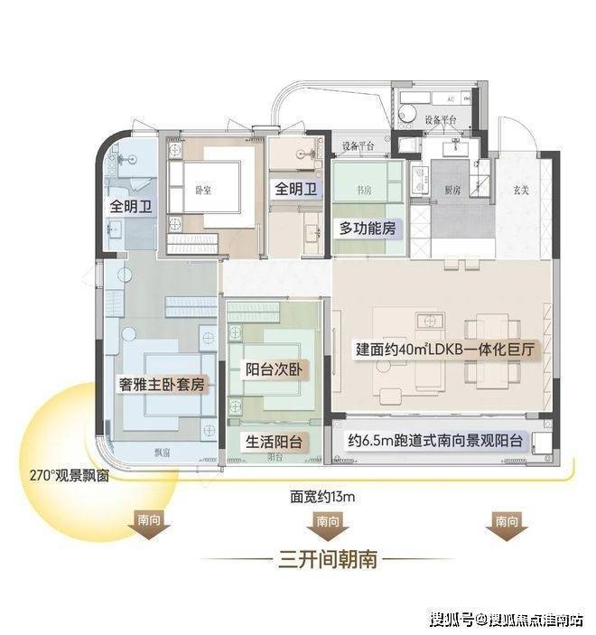 南向约13米奢尺开间,约9.5米超大面宽双阳台,PLUS级宽阔格局,舒享气派人生。