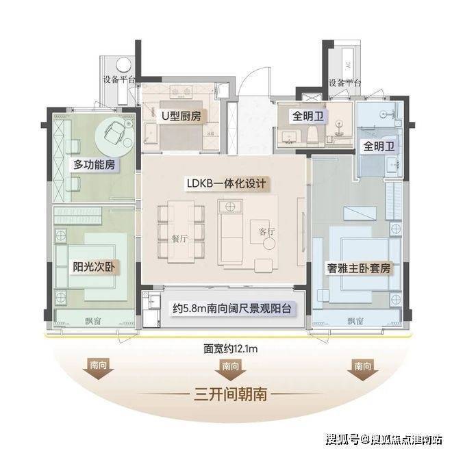 三开间朝南面宽达约12.1米,搭配约5.8米南向封包阳台,采光一流,伺花弄草、阅读品茶等生活的多重场景都可以实现。