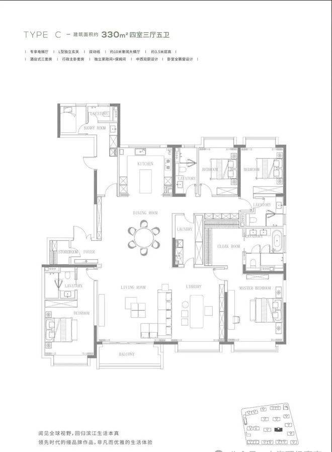 室内空间方面:项目打造私密纯粹的精装大平层、约3.3米层高(一期)、每户都有私享独立的电梯厅、270°观景会客厅(部分)!