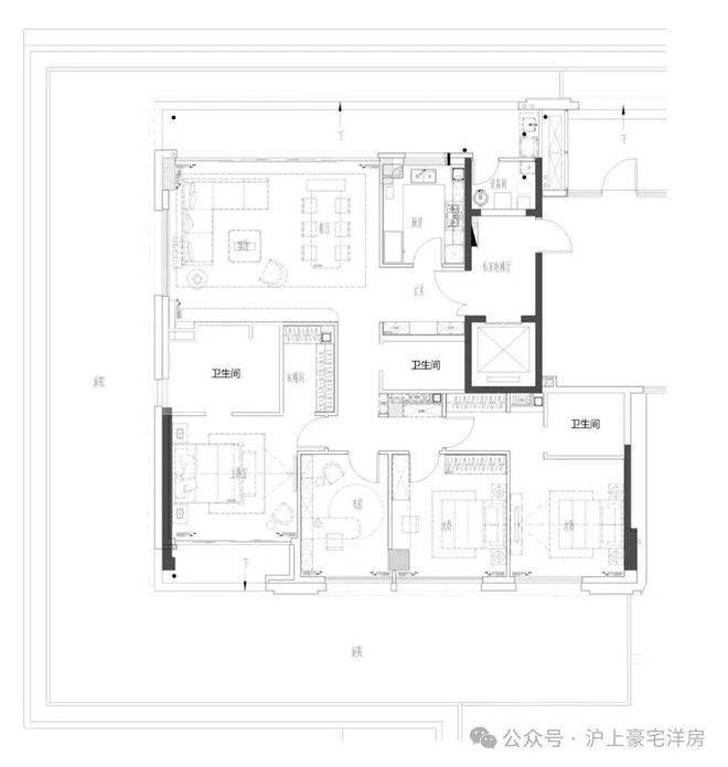 四加一房两厅三卫,户型方正,入户玄关,大面宽客厅,餐客厅一体化,豪华主卧套。